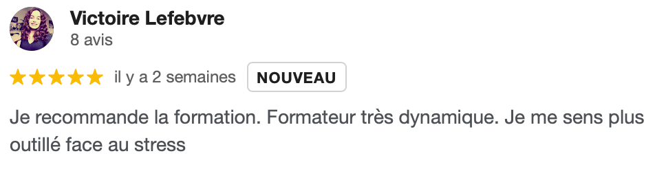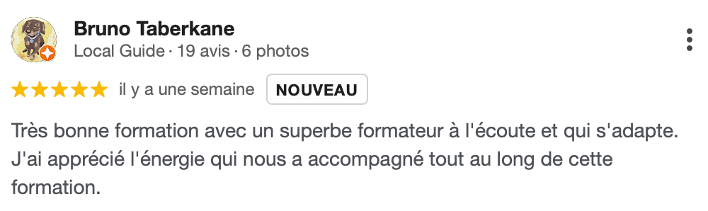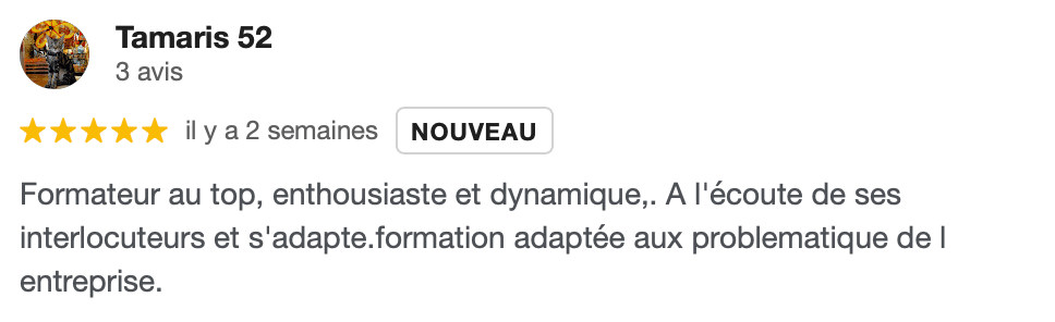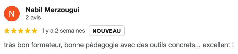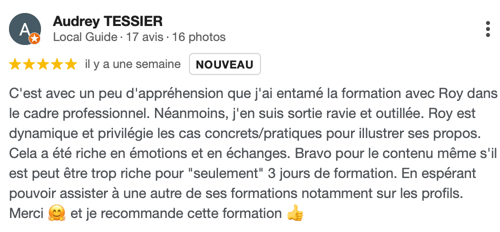 J’ai apprécié l’expertise du formateur, le profilage ainsi que la compréhension de certaines problématiques. Il n’y avait pas de temps morts grâce à son dynamisme.